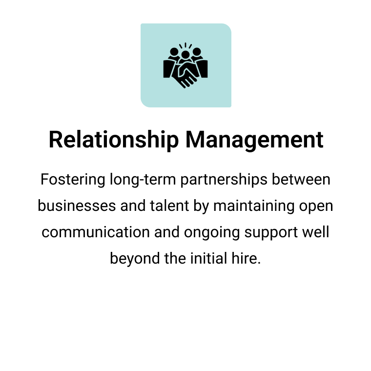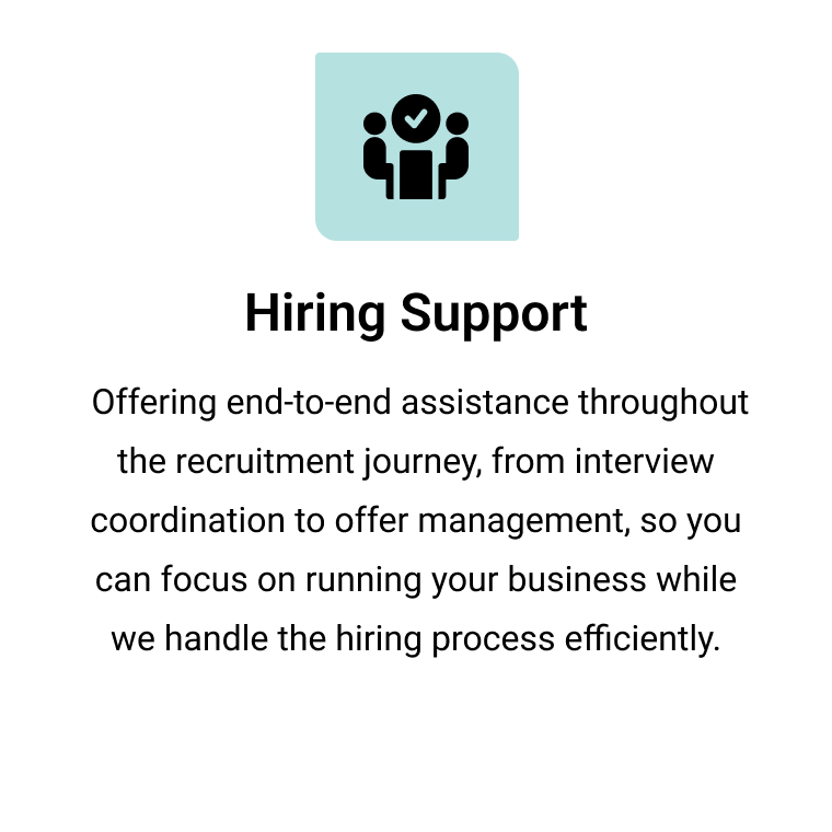 Offering end-to-end assistance throughout the recruitment journey, from interview coordination to offer management, so you can focus on running your business while we handle the hiring process efficiently.